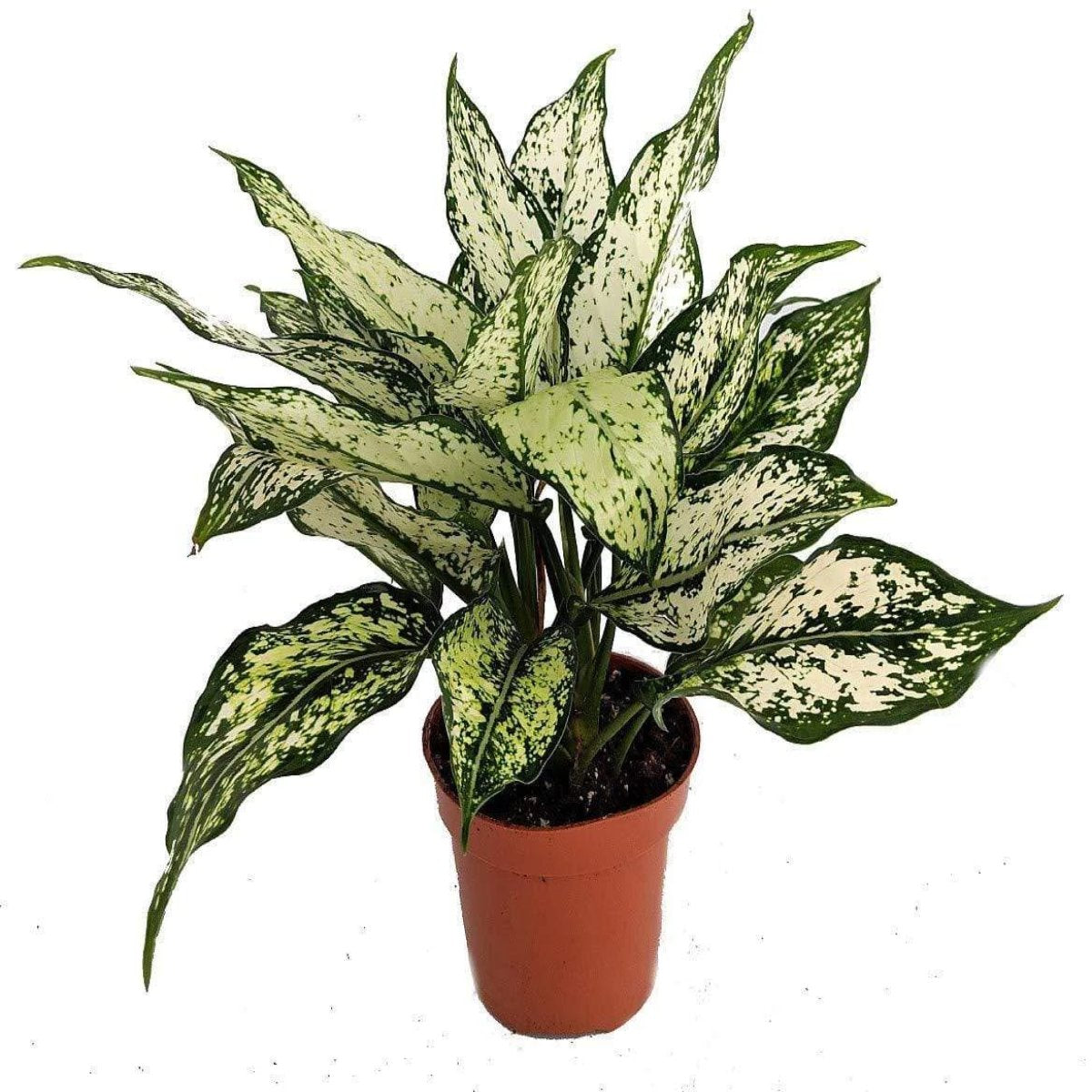 has white variegated leaves with green edges. The bright foliage matches virtually any decor and lightens any kitchen, living room, bathroom, or bedroom. The White Aglaonema Plants are an attractive indoor plant that requires little maintenance. Splashes of white almost look like freshly fallen snow on the dark green leaves.