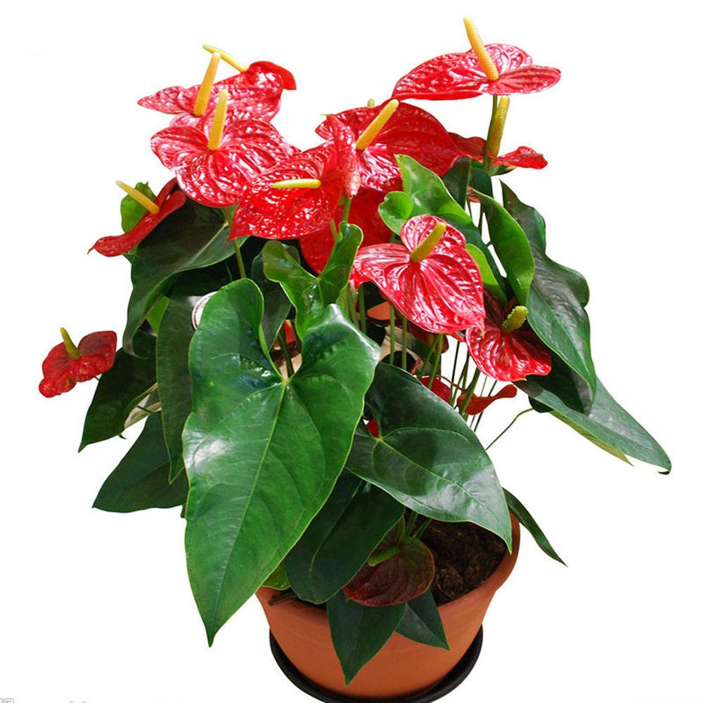 Red Anthurium Plants commonly called Flamingo Flower does well with bright, indirect light and high humidity. These cheery flowers brighten up spaces indoors and look beautiful when placed in a matching brightly colored pot.