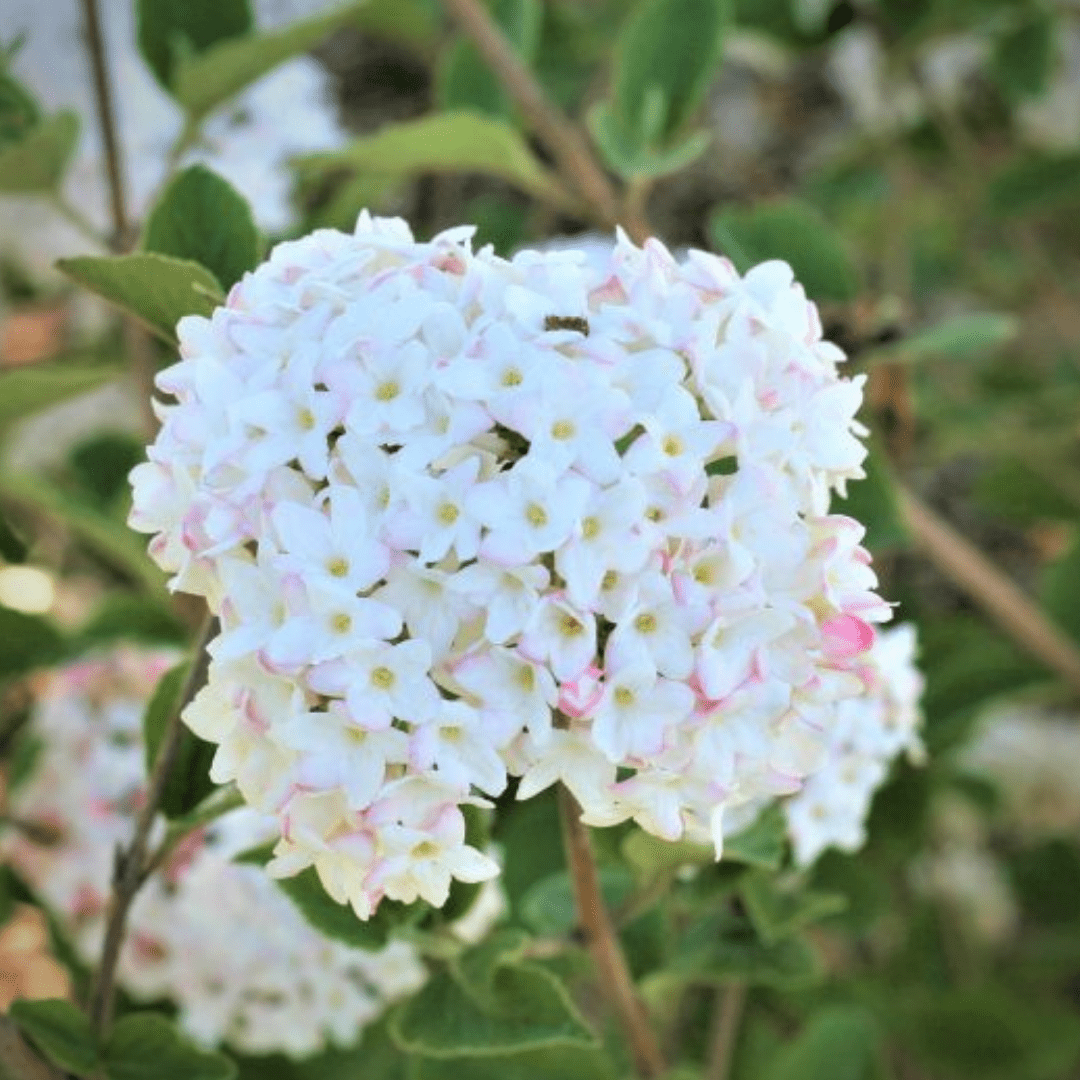 Spice Baby Viburnum or Viburnum carlesii is a showy dwarf flowering shrub known for its white snowball-shaped blooms and dark green foliage. In the spring, red buds emerge and transition to a soft shade of pink, and graduate to a white showy spectacle. Spice Baby Viburnum has year-round interest for its dark green foliage that changes to a crimson red hue in the fall and winter months.