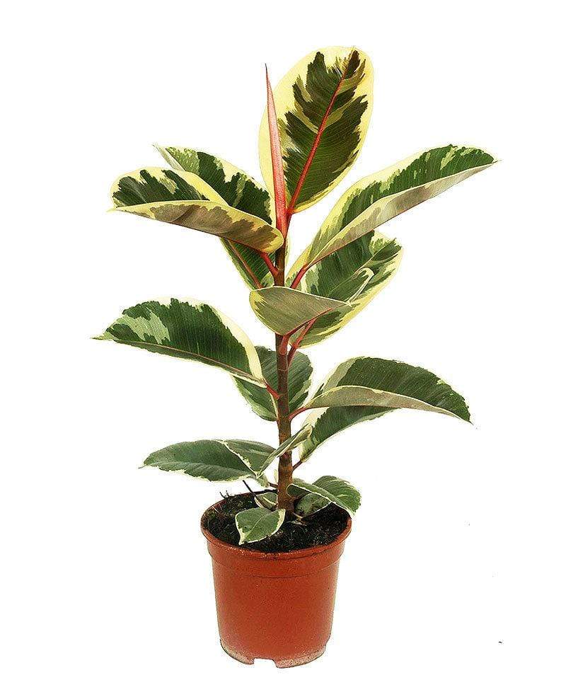 Ficus Tineke is a low to bright light houseplant that likes to dry out in between watering. The darkly colored foliage highlighted with borders of white fit well with many kinds of decor.