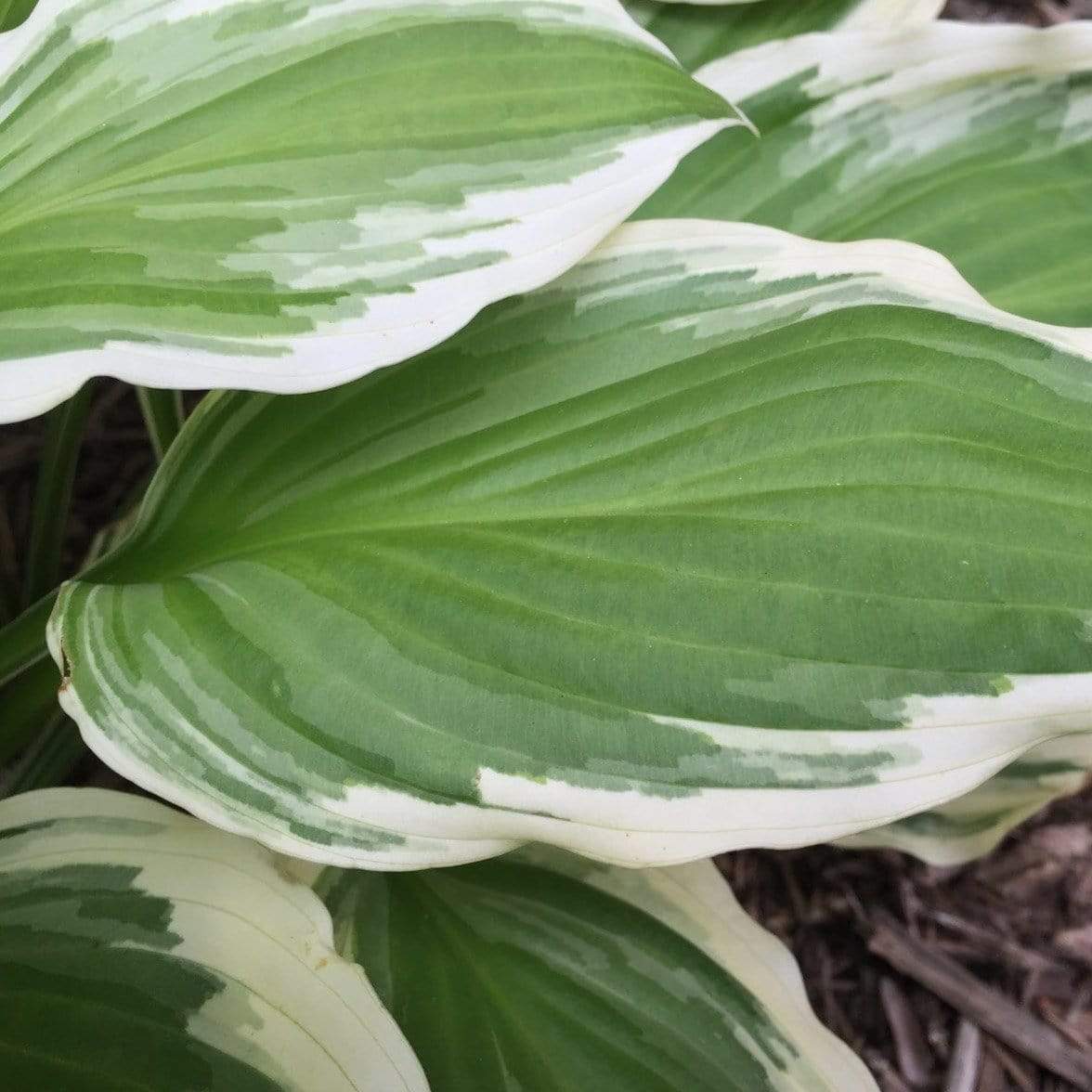 Hosta Patriot boasts strong white margins on dark green heart-shaped leaves. Looks good all season. Prefers bright shade and humus-rich, moist, well-drained soil, but will tolerate average to dry soils and full shade. Green leaves edged in white and contrast to the shade garden!
