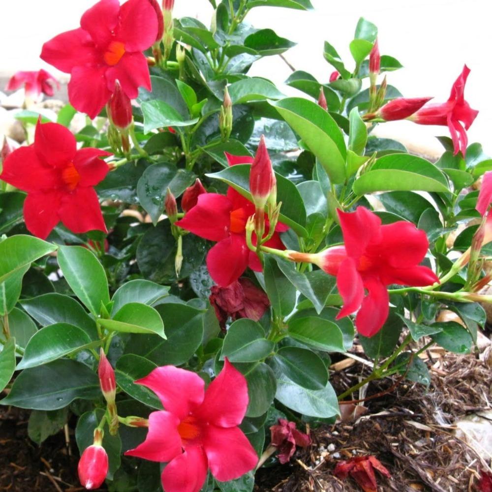 This tropical twining vine grows well with other flowers, and can grow up to heights of 20 feet with the proper care and attention. Mandevilla grows well in containers and in planter beds.