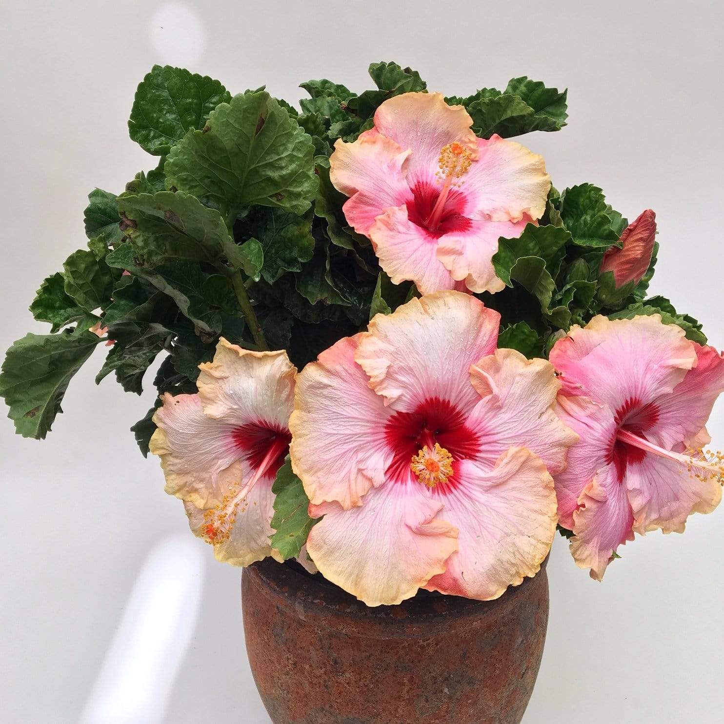 Paradise Hibiscus are flowering perennials that are best known for their stunning ombre blooms that can grow up to 8" across. The huge flowers of this tropical Hibiscus have ruffled, overlapping petals and an airbrush color effect. Paradise Hibiscus is a compact perennial plant that does well in containers on sunny patios, porches, or decks. It flowers over a longer period of time than other Hibiscus cultivars so you can enjoy the blooms all summer long. The ruffled petals fade to a different color along their edge and if you buy your Paradise Hibiscus online, the color of the bloom will be a surprise! We have varieties that are red in the center, fading into light pink and yellow but also flowers that have a periwinkle and orange fade; both are equally beautiful!