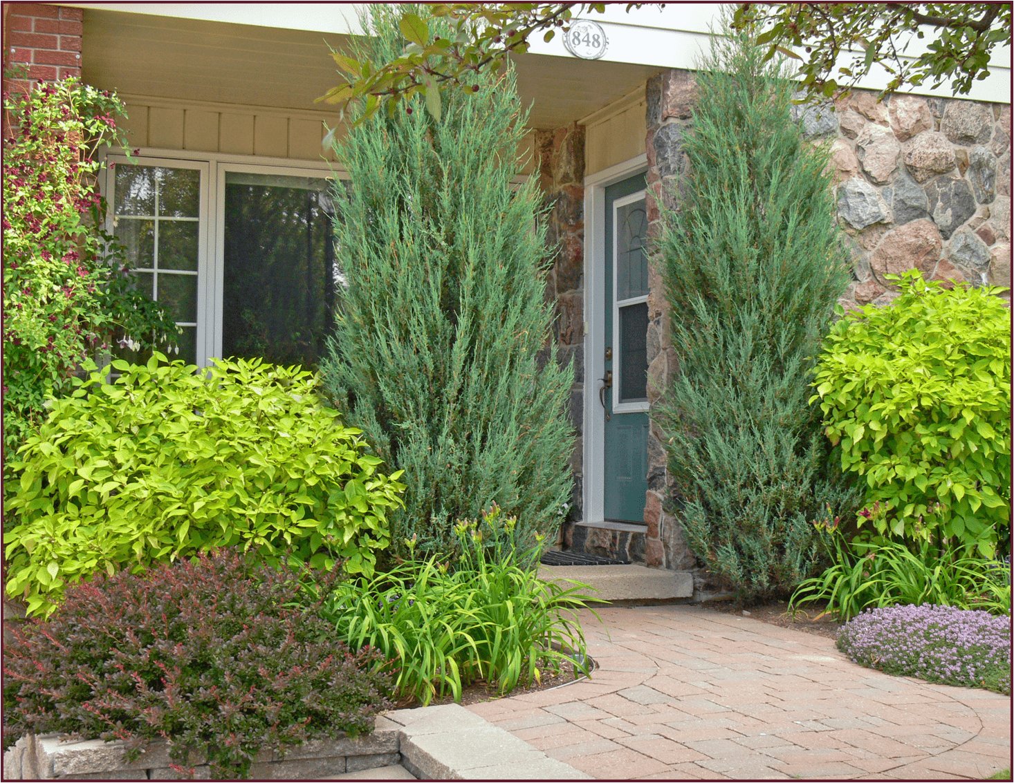 The stately, columnar form makes the Sky Rocket Juniper the narrowest juniper available, best used as an entrance or to define a boundary. Excellent when used as a vertical accent. Durable and versatile. Very little care needed.