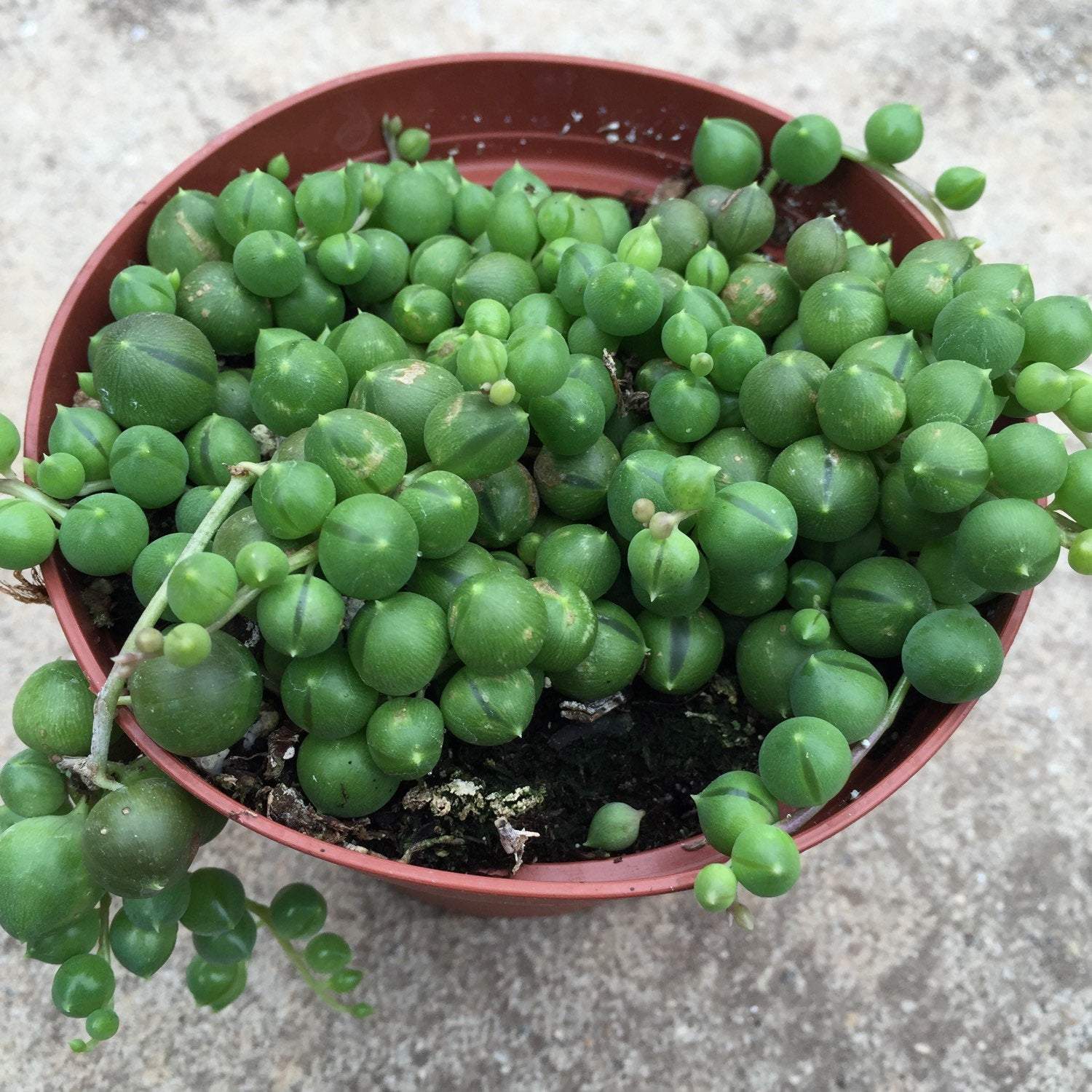 Senecio rowleyanus, commonly known as string of pearls plants or string-of-beads, is a creeping succulent vine. It is native to the drier parts of southwest Africa. In its natural environment, its stems trail on the ground, rooting where they touch and forming dense mats. It often avoids direct sunlight by growing in the shade of other plants and rocks.